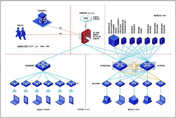 遵循安全、可靠、穩(wěn)定、高效的原則,把網(wǎng)絡(luò)劃分成5個(gè)區(qū)域。分別是遠(yuǎn)程接入?yún)^(qū)域(L2TP over IPSEC VPN)、互聯(lián)網(wǎng)區(qū)域(untrust)、服務(wù)器區(qū)域(DMZ)、辦公區(qū)域(trust),其中辦公區(qū)域分為有線辦公區(qū)域(Lan)和無線辦公區(qū)域(Wireless)。