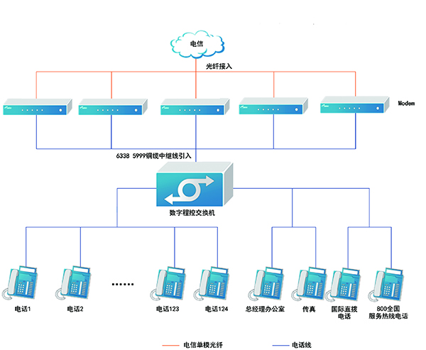 根據(jù)以上要求,公司語音通信系統(tǒng)采用集團(tuán)電話數(shù)字程控交換機(jī)實(shí)現(xiàn)多終端語音通信功能。根據(jù)綜合布線子系統(tǒng),本系統(tǒng)設(shè)計(jì)滿足120個(gè)終端使用,系統(tǒng)接入6部普通外線號(hào)碼及4部專用語音外線號(hào)碼,通過光纖解調(diào)器統(tǒng)一接入程控交換機(jī)。系統(tǒng)選用擴(kuò)容型插卡結(jié)構(gòu)數(shù)字程控機(jī),配置為8外線104分機(jī),交換機(jī)所有模塊均采用插卡結(jié)構(gòu),在維護(hù)、升級(jí)機(jī)器中,分機(jī)卡與外線卡通用(8外線一個(gè)卡/8分機(jī)一個(gè)卡),擴(kuò)容方便,節(jié)約成本,系統(tǒng)可擴(kuò)容至16外線128分機(jī),滿足擴(kuò)展性的要求。