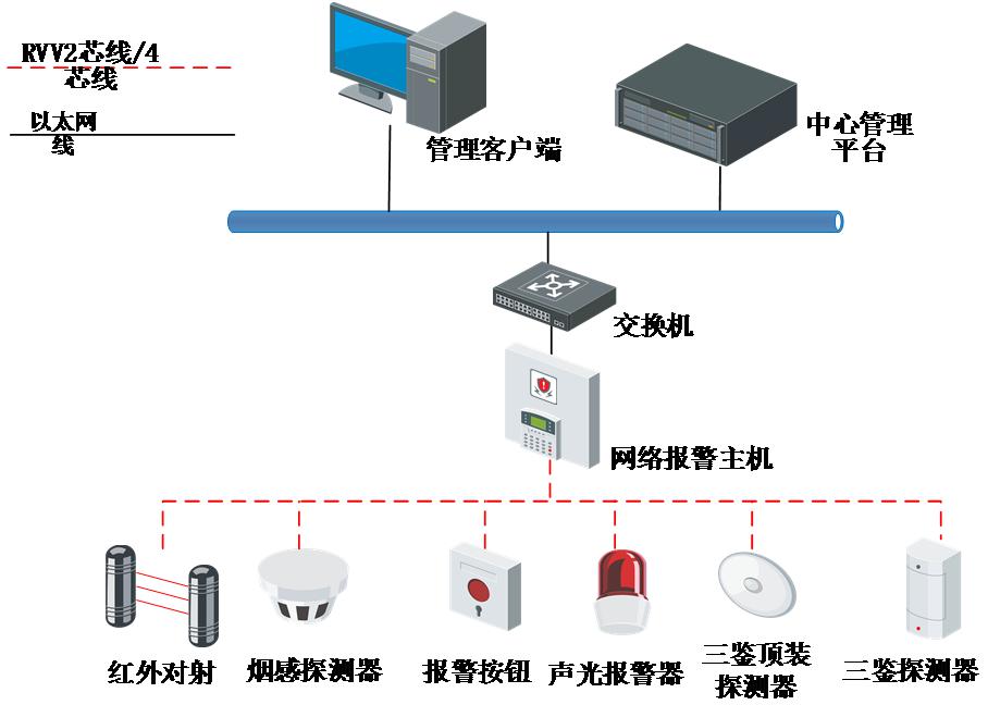 緊急報(bào)警按鈕、紅外雙鑒探測(cè)器、煙感探測(cè)器等前端報(bào)警采集設(shè)備通過(guò)RVV2芯/ RVV4芯線纜接入部署在機(jī)房的報(bào)警主機(jī)。