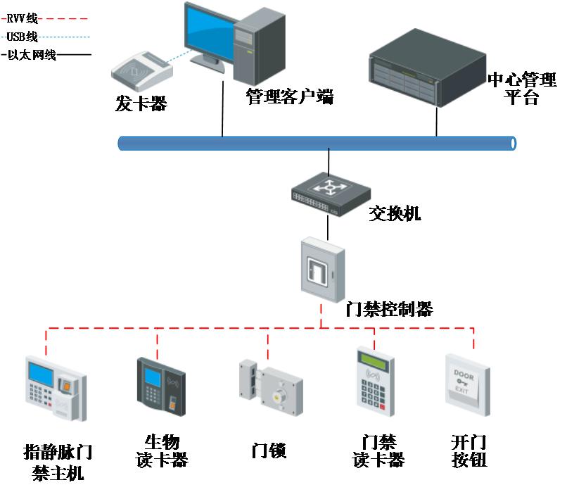 門禁讀卡器、生物識(shí)別讀卡器、開(kāi)門按鈕、磁力鎖等前端門禁設(shè)備通過(guò)RVV4*0.75/ RVV2*0.75線纜接入到網(wǎng)絡(luò)門禁控制器上,而網(wǎng)絡(luò)門禁控制器通過(guò)非屏蔽雙絞線接入交換機(jī)經(jīng)局域網(wǎng)集成到安防綜合管理平臺(tái)上。