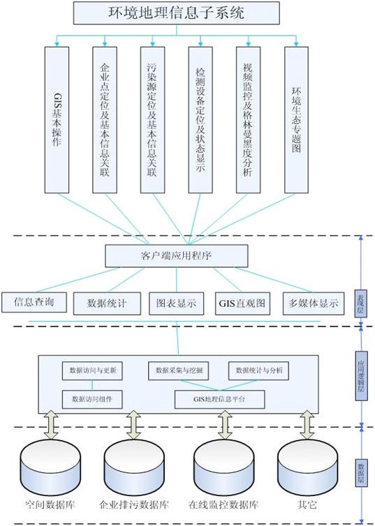 環(huán)境GIS充分利用現(xiàn)代計算機(jī)技術(shù)優(yōu)勢,發(fā)揮強(qiáng)大的計算統(tǒng)計功能、可視化功能和多媒體展示功能,來管理和利用環(huán)境保護(hù)信息。其系統(tǒng)結(jié)構(gòu)框圖如下: